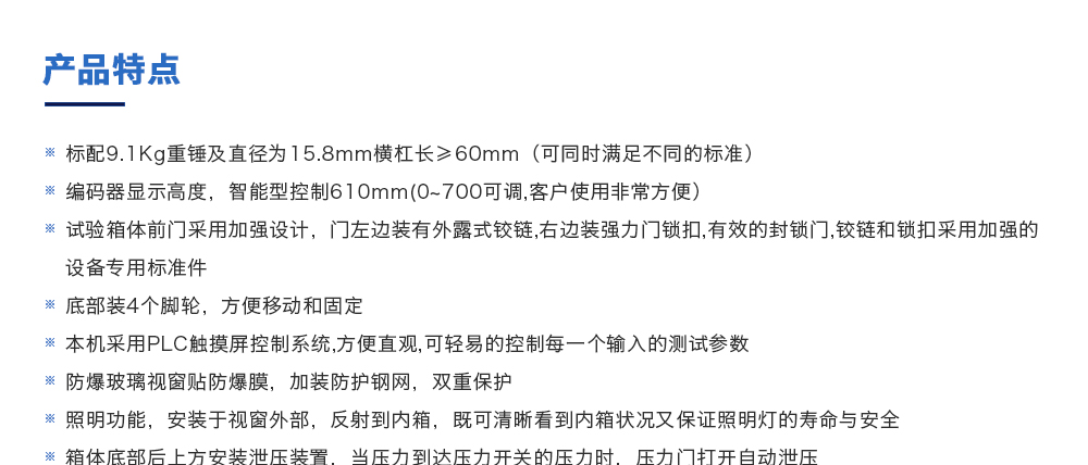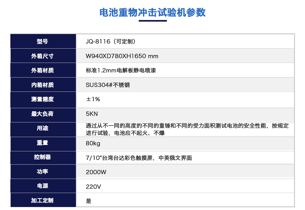 產(chǎn)品型號:JQ-8116(定制款) 品牌:劍 喬 用途:電池重物沖擊試驗機是模擬通過從不一同的高度的不同的重錘和不同的受力面積測試電池的安全性能,按規(guī)定進行試驗,電池應不起火、不爆炸。也是各電池廠家及研究所必不可少的檢咨詢熱線:13829135130